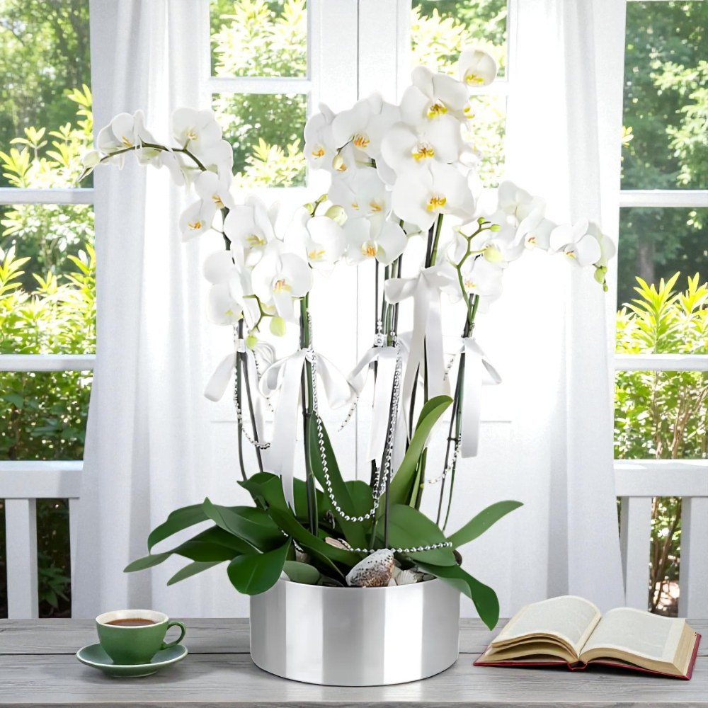 Yoğun çiçekleri ve muhteşem duruşuyla 6 dal beyaz orkide, sevdiklerinize unutulmaz bir çiçek deneyimi sunar.