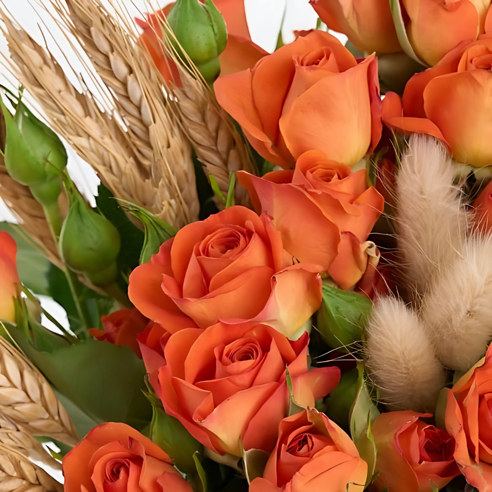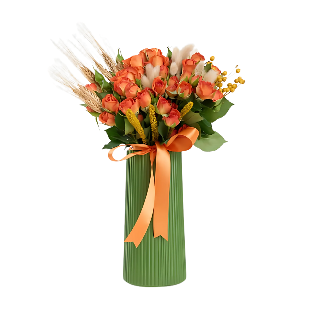 Turuncu çardak güllerle hazırlanan bu yeşil vazolu aranjman, sıcak tonlarıyla dikkat çeker.