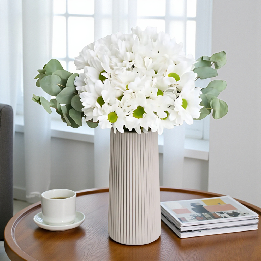 Bej vazoda beyaz papatyalar, huzurlu ve sakin bir hava yaratırken sevdiklerinize zarif bir hediye sunuyor.