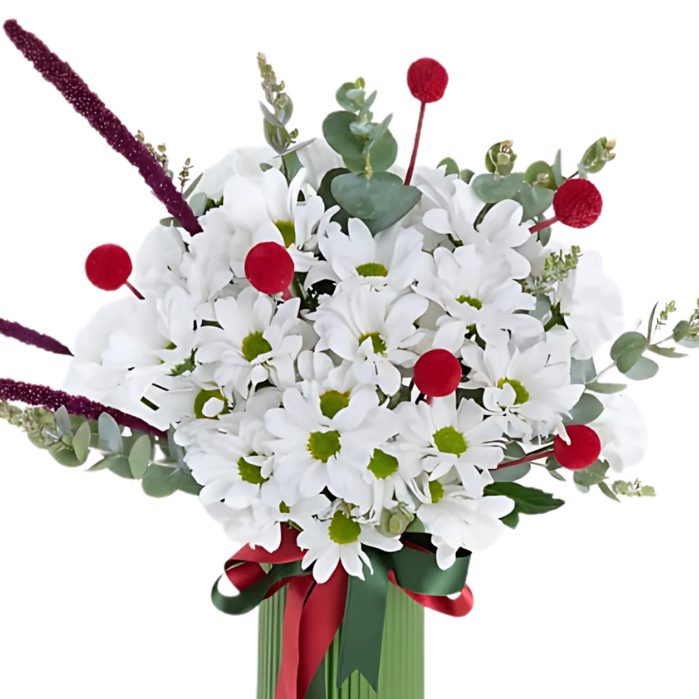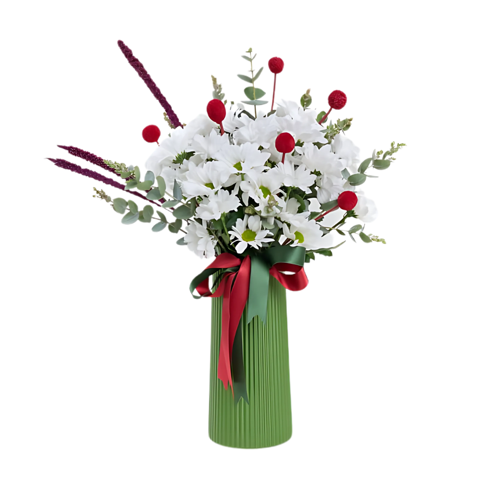 Berry Field – Yeşil Vazoda Beyaz Papatya ve Kırmızı Craspedia