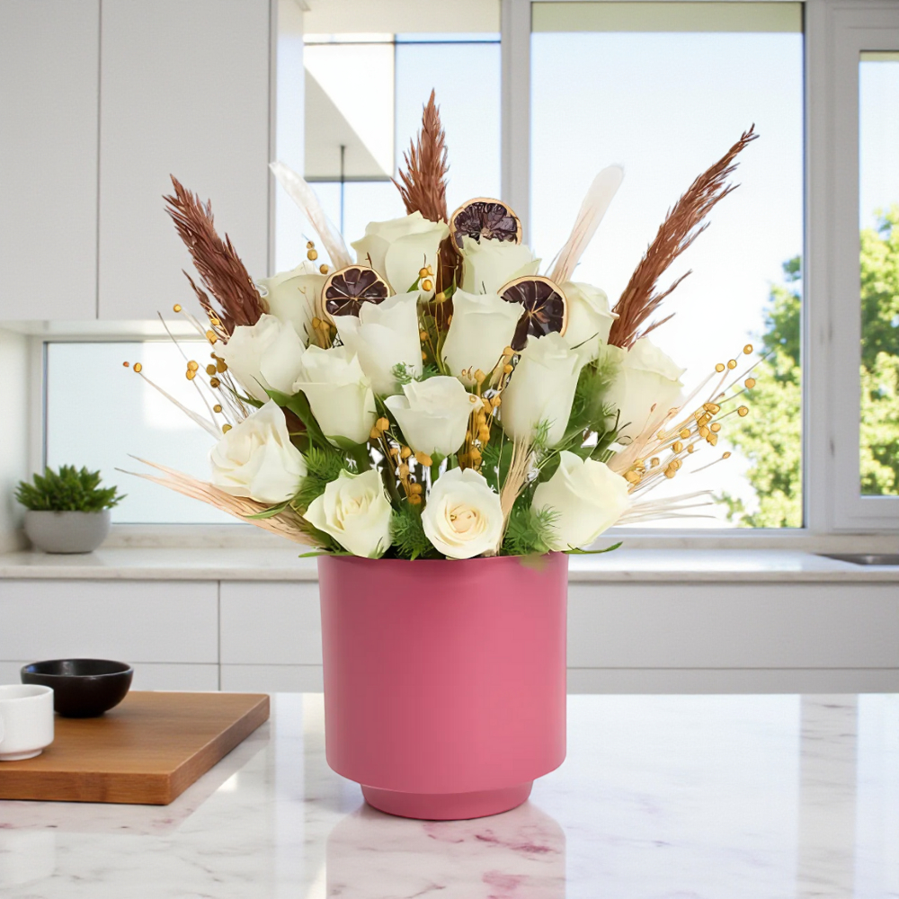 Doğal ve modern beton saksıda beyaz güller, sade ama etkileyici bir hediye alternatifi sunuyor. Zamansız şıklığı keşfedin.