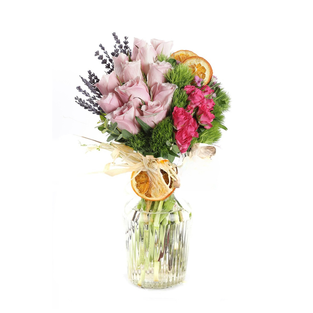 Pembe tonlarının zarif uyumu, premium cam vazo ile bütünleşerek romantik bir atmosfer yaratır.