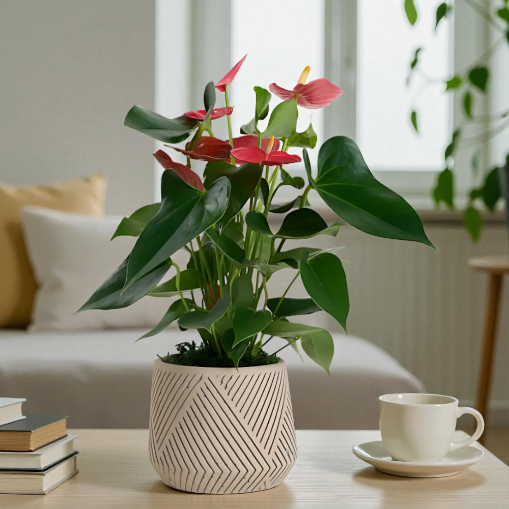 Göz alıcı desenli saksısı ile kırmızı antoryum, bulunduğu ortama şıklık ve canlılık katar. Uzun ömürlü ve bakımı kolaydır.