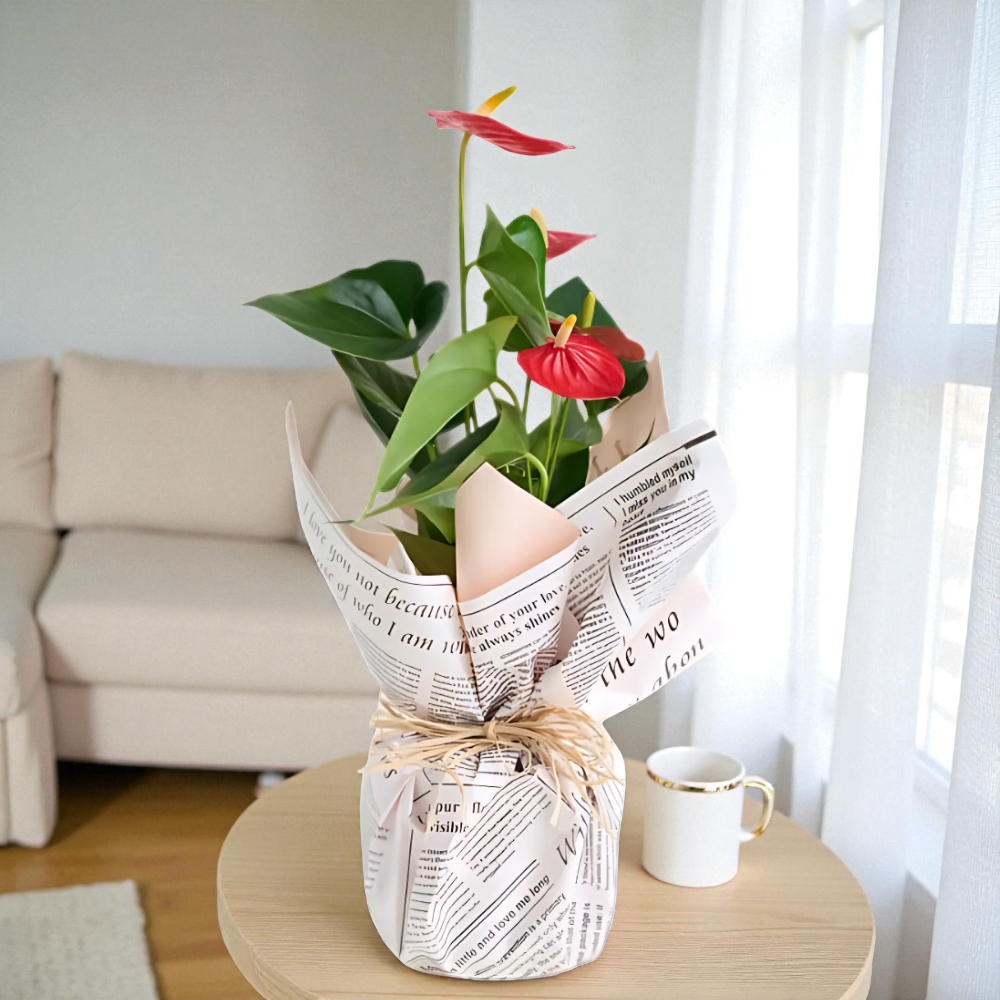 Gazete desenli özel tasarım saksıda, buket süslemesiyle tamamlanan kırmızı antoryum çiçeği, dekoratif ve anlamlı bir hediye seçeneğidir.