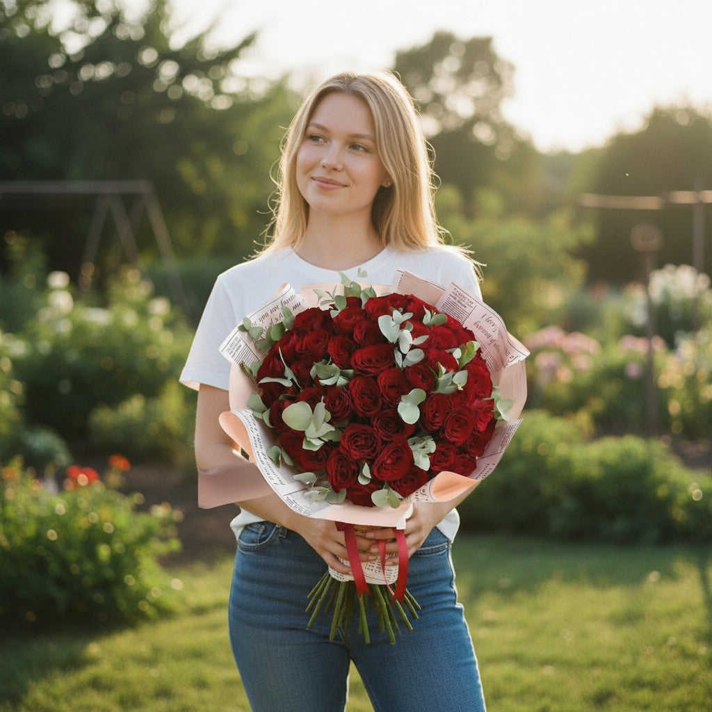 Gazete kağıdına sarılmış 50 kırmızı gül, şıklığı ve nostaljik havasıyla eşsiz bir hediye.