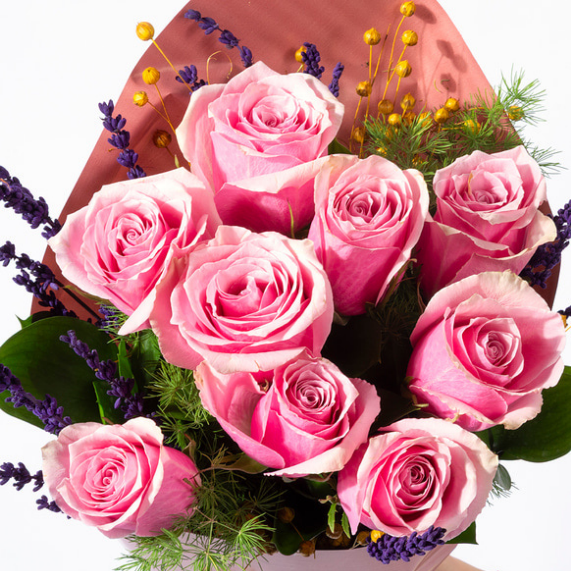 Somon bukette 9 pembe gül, sarı luna ve lavanta ile hazırlanmış yumuşak tonlu özel bir aranjman.