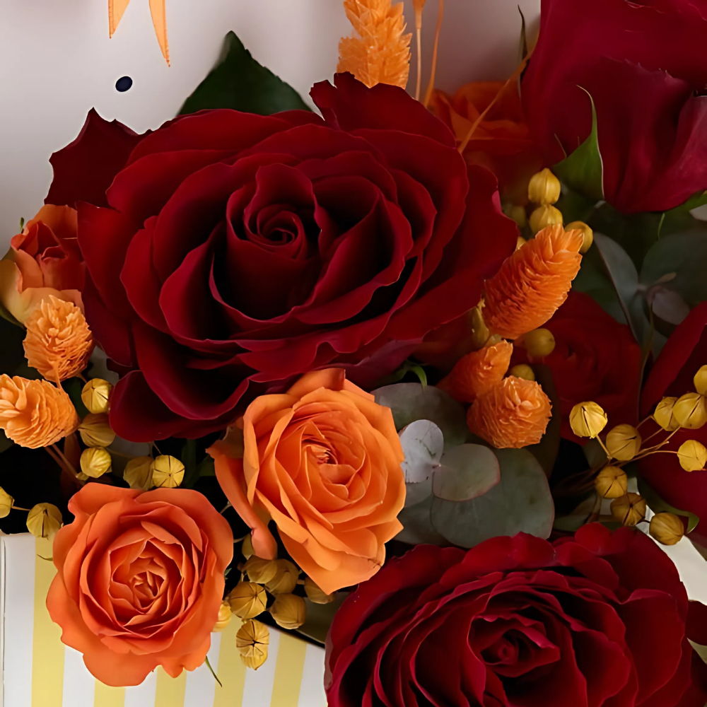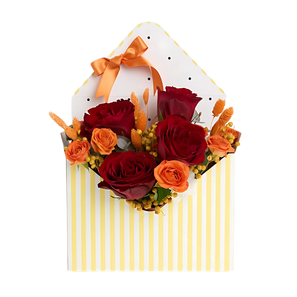 Kırmızı ve turuncu güllerin buluştuğu sarı zarf kutu, enerjik ve canlı bir seçimdir.