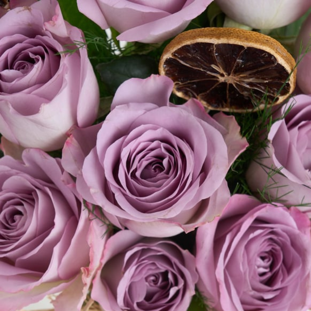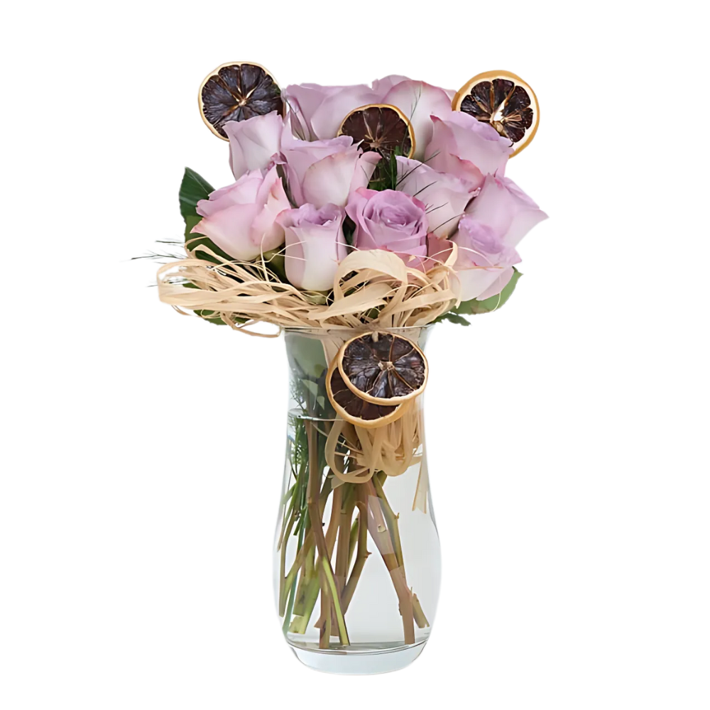 Mor tonlarının huzur veren etkisini yansıtan 12 adet lila gül, sade cam vazo içinde modern ve göz alıcı bir bütünlük sunuyor. Dinginlik arayanlara özel bir seçim.