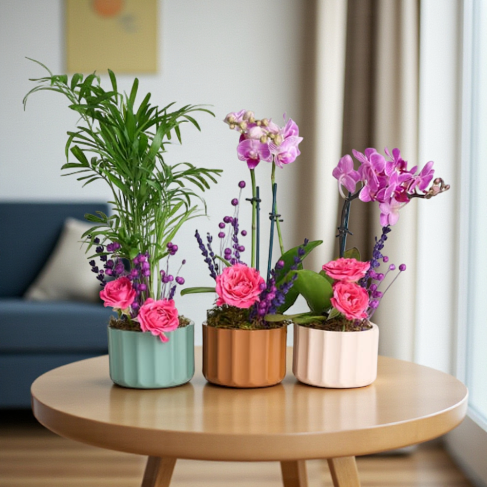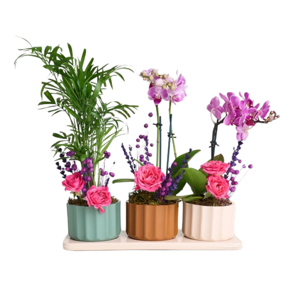Lush Balance, mini orkide ve chamdora palmiyesini tek bir saksı düzeninde buluşturur. Doğal, dengeli ve huzurlu bir his sunar. Ofis veya ev ortamlarında dekoratif şıklık arayanlar için idealdir.