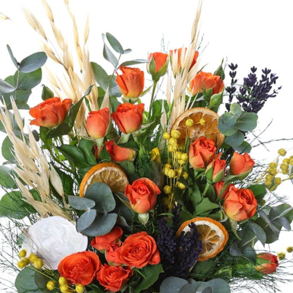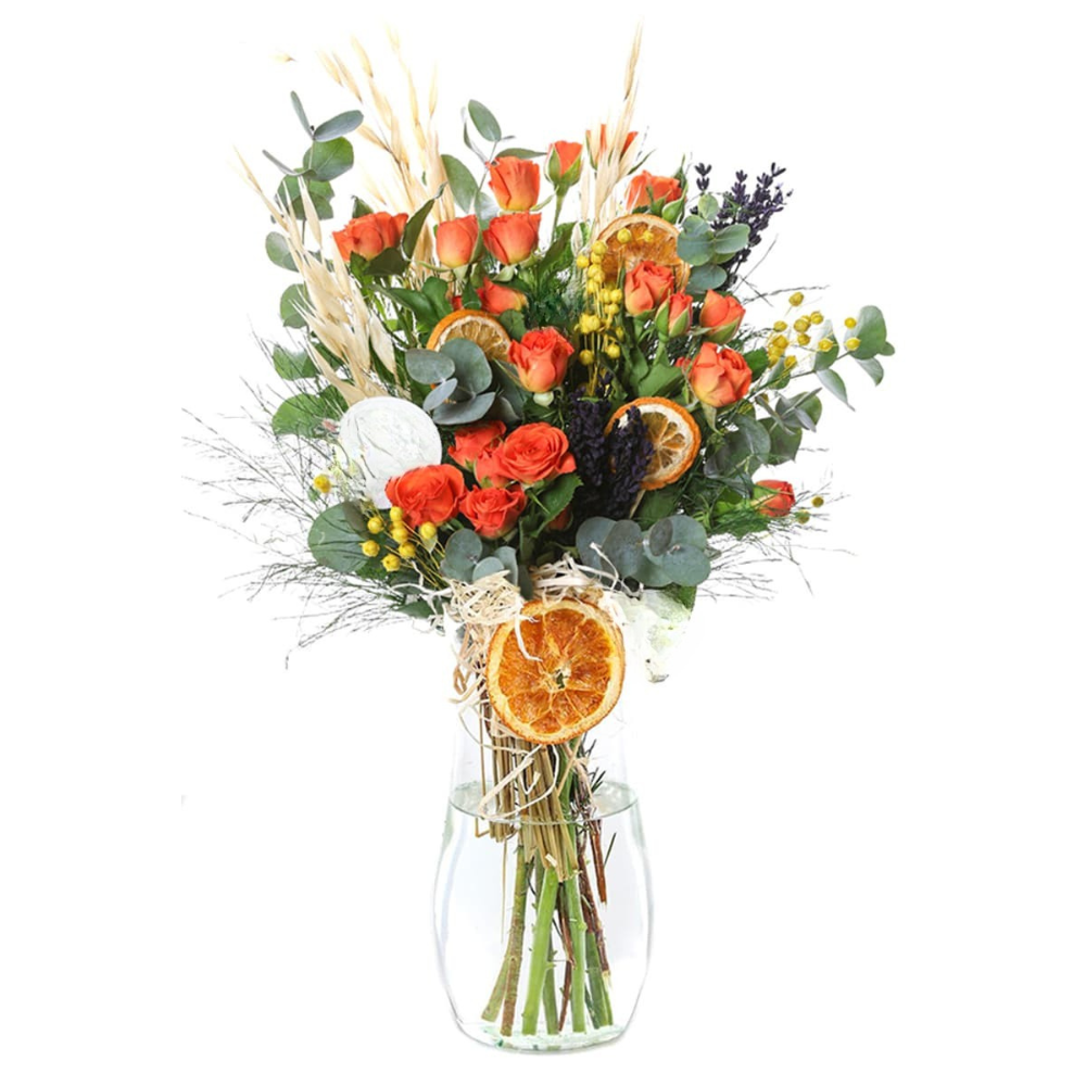 Turuncu çardak güllerin canlı enerjisi, cam vazoda sıcak ve samimi bir atmosfer yaratıyor.