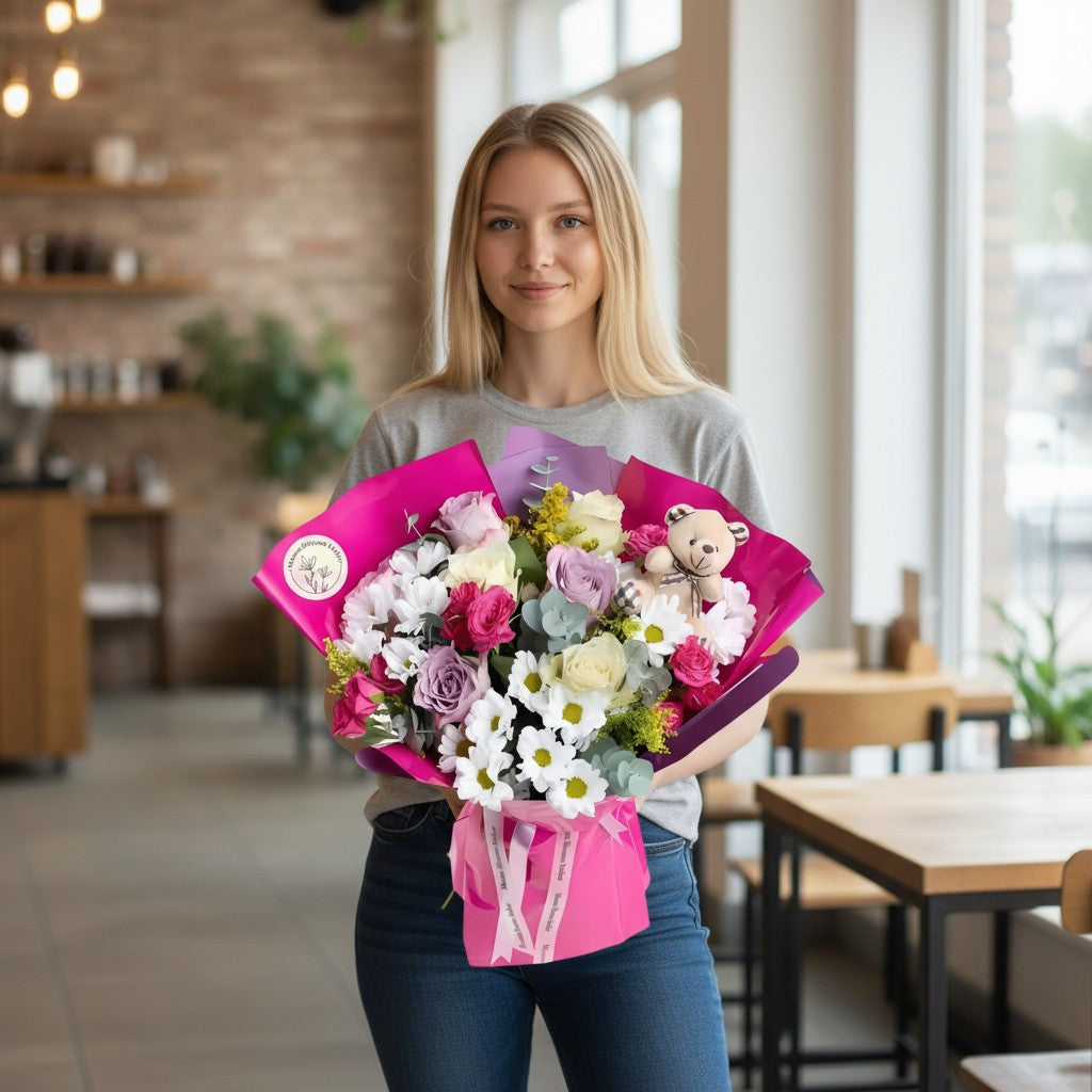 Pembe buket içinde renkli güller ve küçük bir ayıcık, tatlı bir dokunuşla sevginizi ifade ediyor. Hem şık hem de anlamlı bir hediye alternatifi.