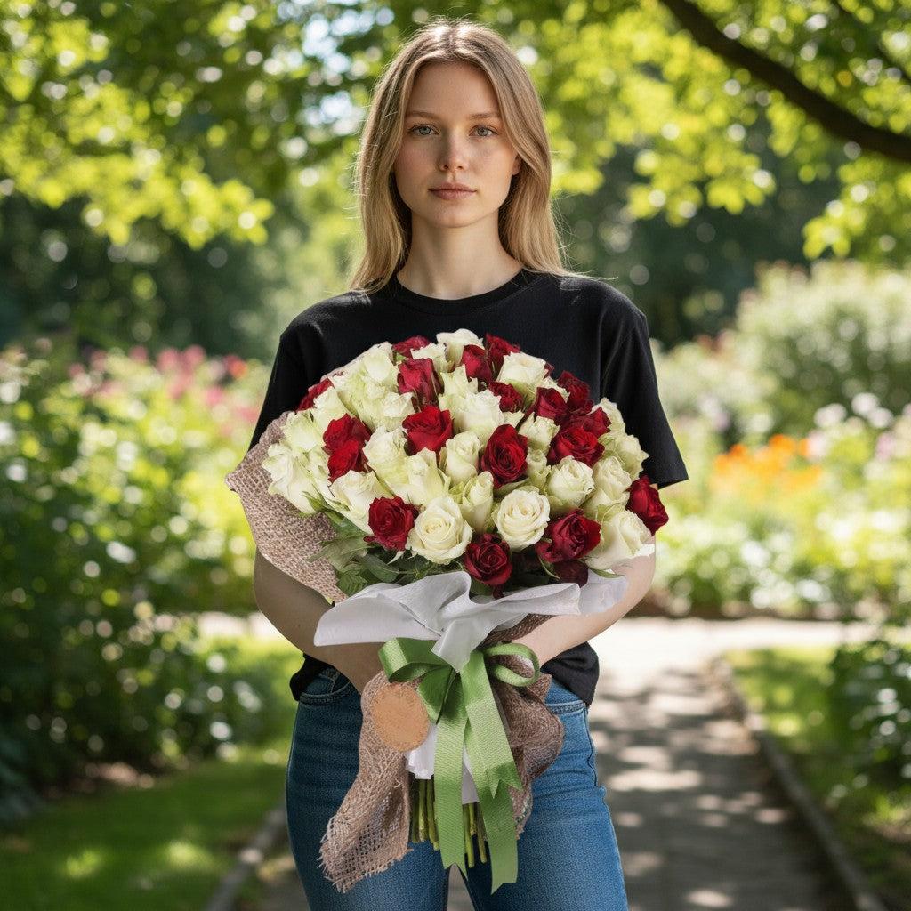60 adet beyaz ve kırmızı gül, premium kaliteyle bir araya getirilerek şık bir buket oluşturuluyor. Büyük sürprizler için ideal.