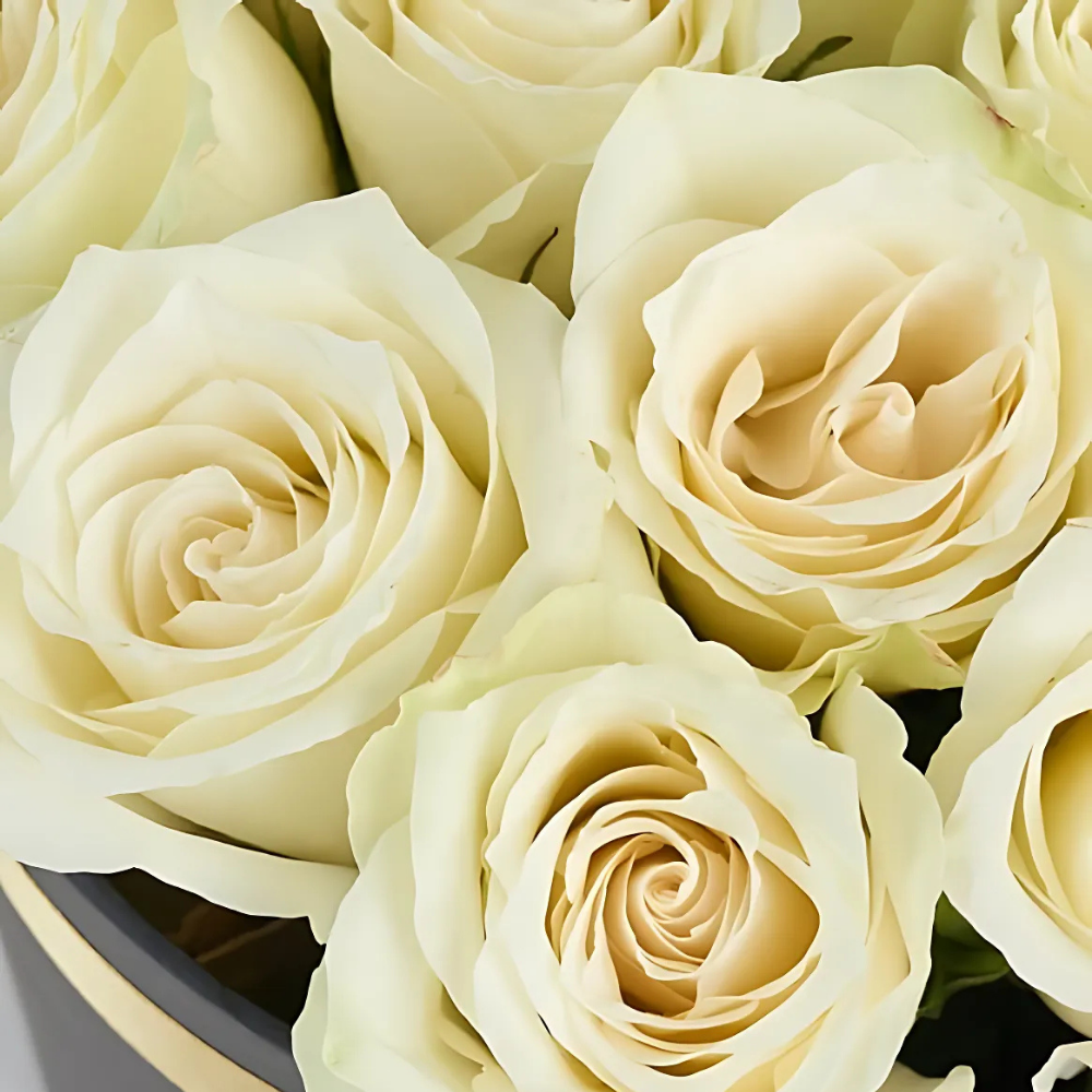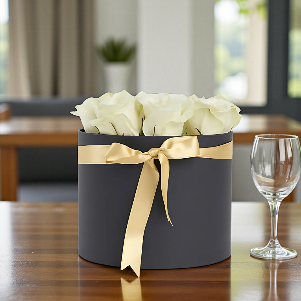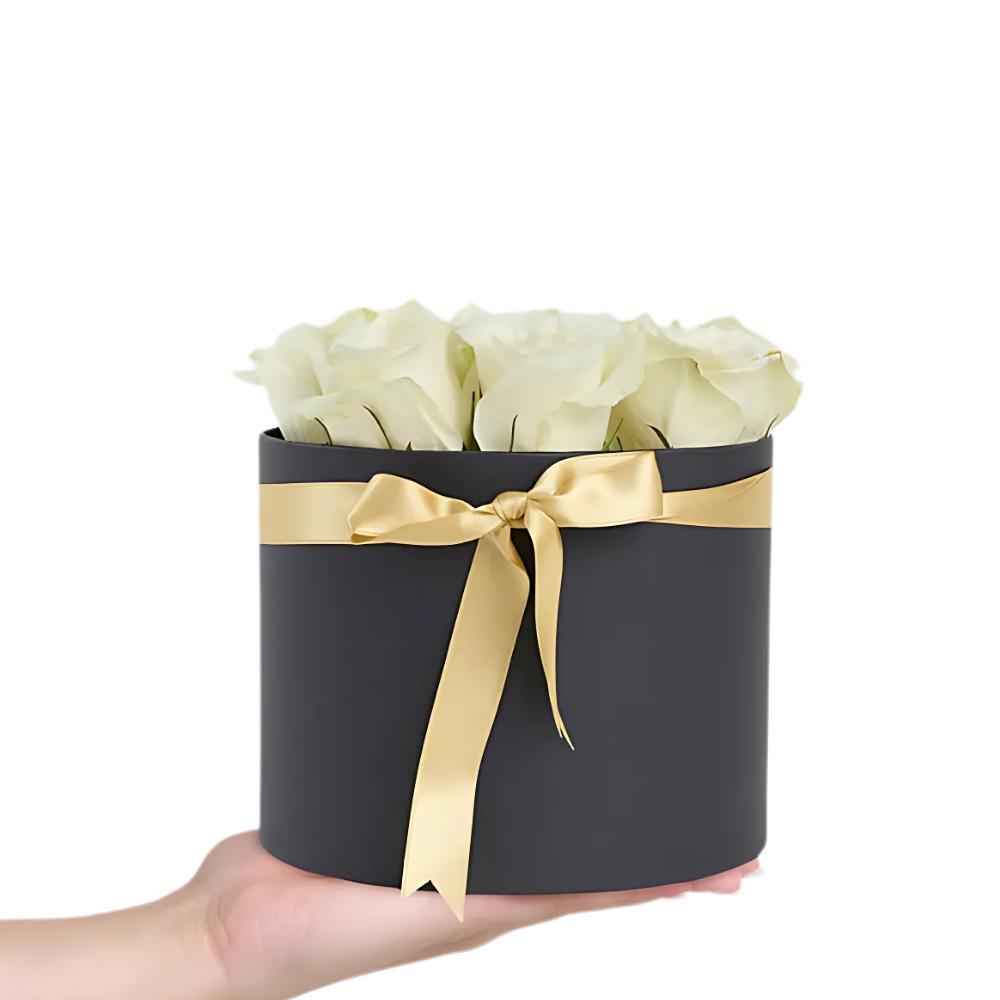 Beyaz güllerin sade güzelliği siyah silindir kutuda şık ve zarif bir sunuma dönüşüyor.