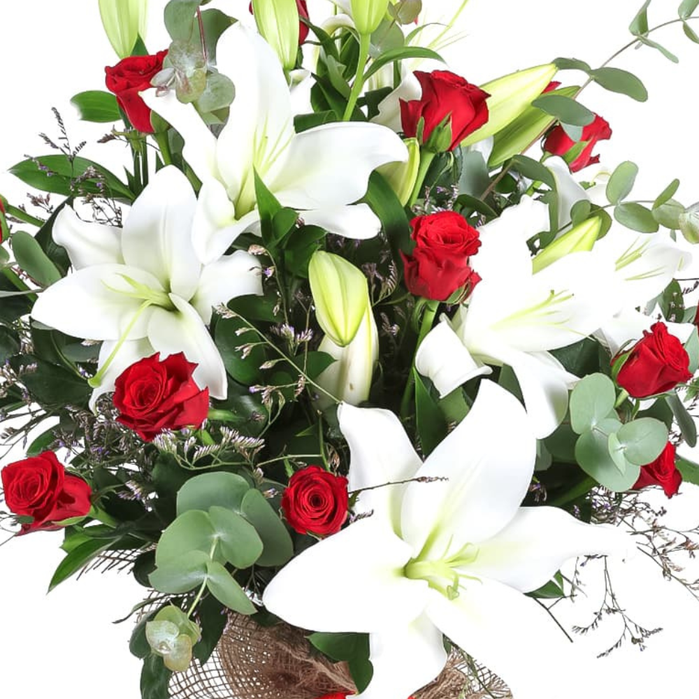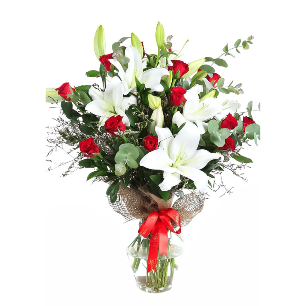 Lilyumların zarafeti kırmızı güllerle birleşerek cam vazoda etkileyici bir kompozisyon sunar.