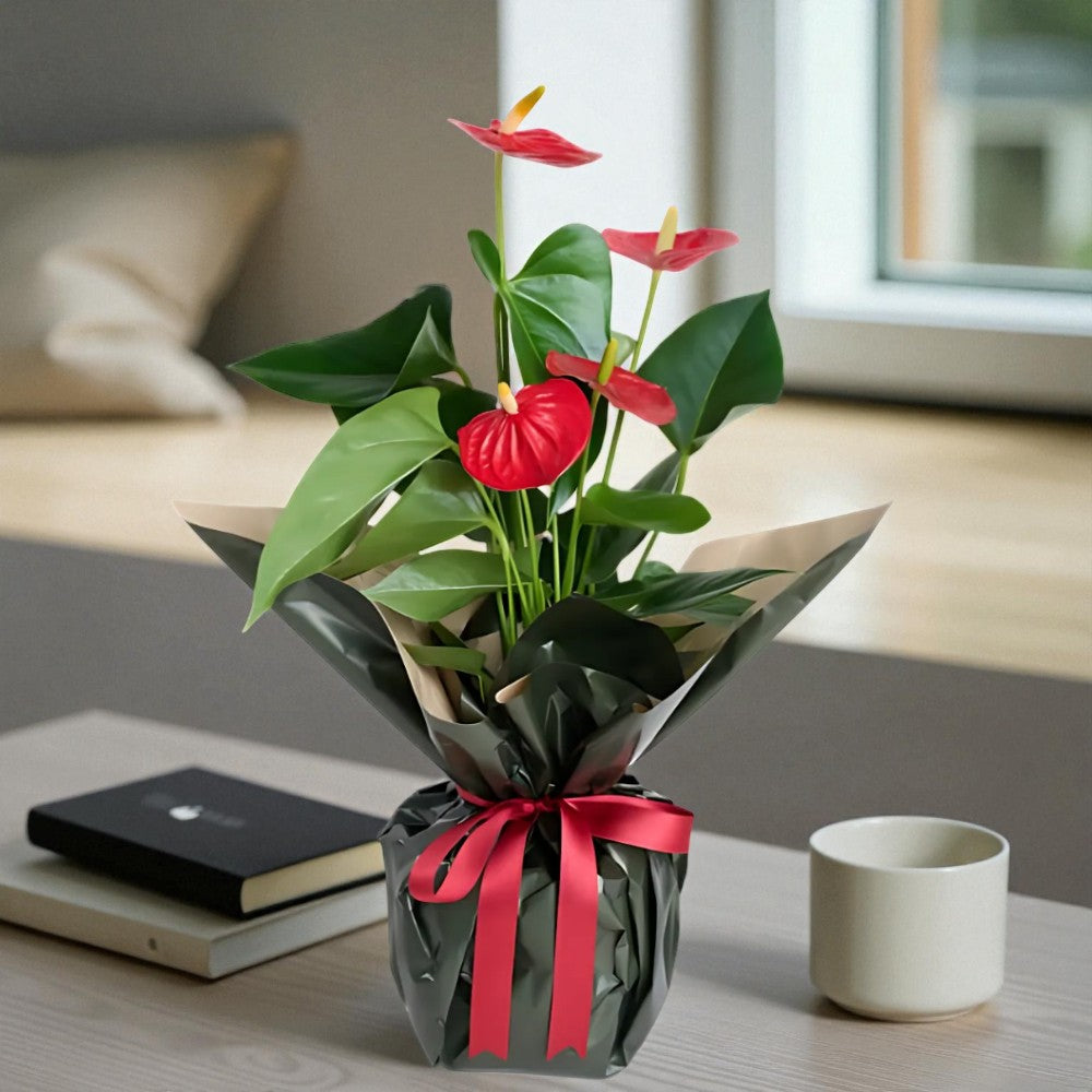 Zarif seramik saksı içinde yer alan kırmızı antoryum, dekoratif görünümü ve uzun ömürlü yapısıyla yaşam alanlarınıza estetik bir dokunuş katıyor.