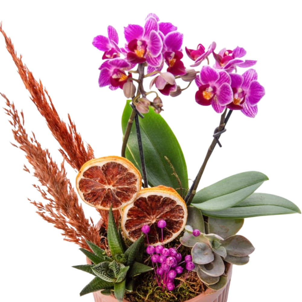 Terra Duo, doğal kiremit saksısı içinde iki dallı mini orkidesiyle hem estetik hem sade bir tasarım sunar. Minimal dokunuşlarla sevdiklerinize zarafet taşır. İç mekânlar için ideal olan bu aranjman, kalıcı bir mutluluk sunar.