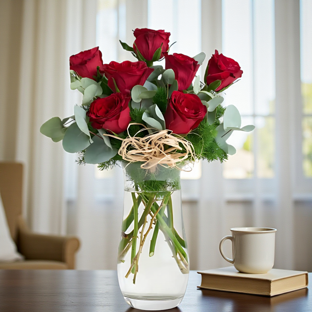 Aşkın ve tutkunun simgesi kırmızı güller, şık cam vazo içinde sunuluyor. Sevdiklerinize duygularınızı en zarif şekilde ifade edin.