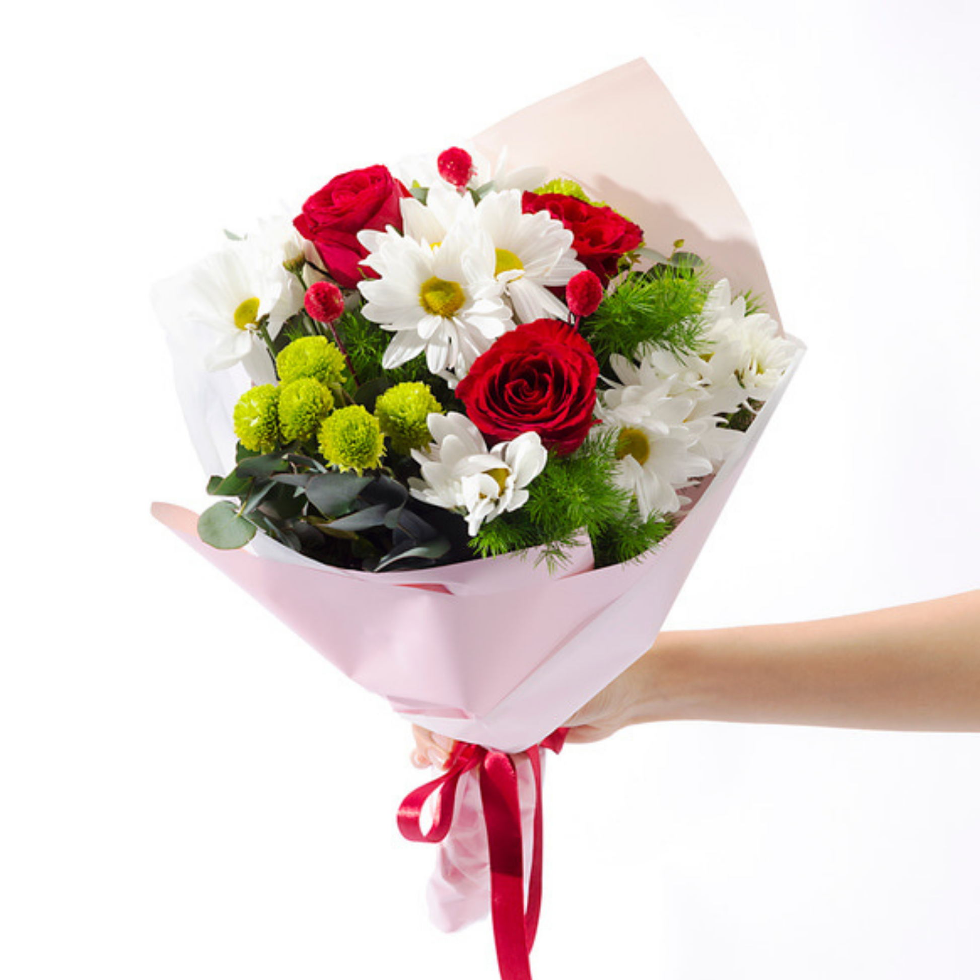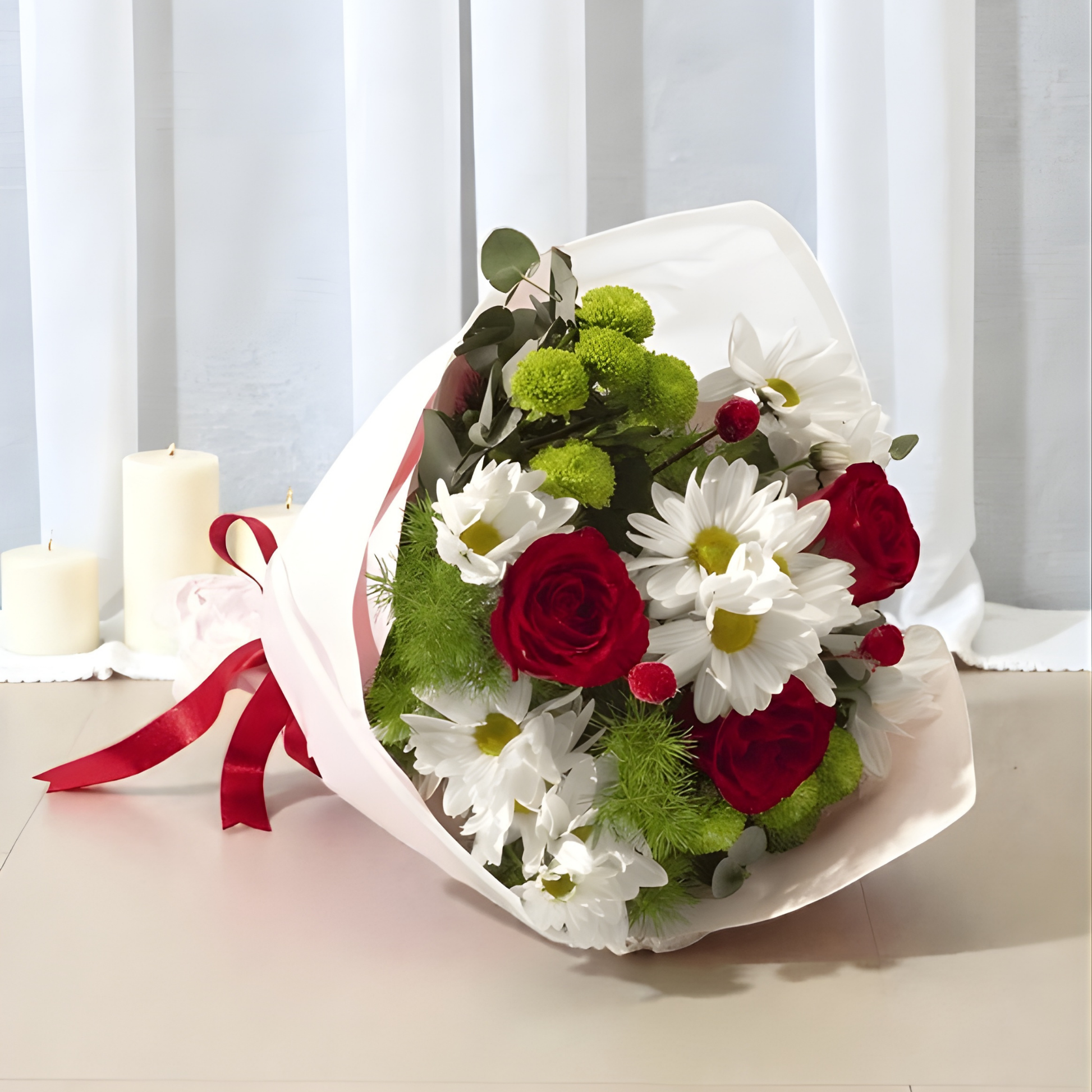 Krem bukette kırmızı güller ve beyaz papatyaların uyumuyla hazırlanan sıcak bir aranjman.
