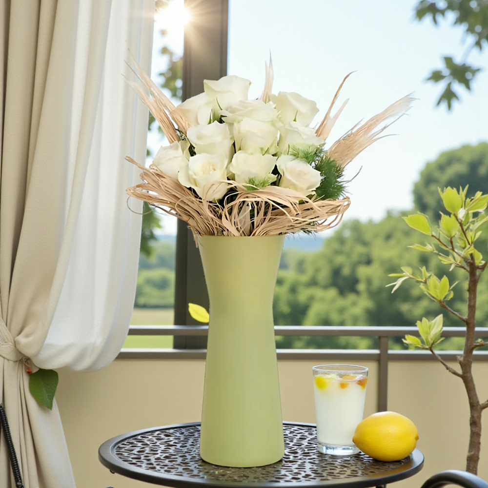 Saflığın ve zarafetin simgesi olan beyaz güller, yeşil cam vazo içinde şık bir sunumla özel anlarınızı tamamlıyor.